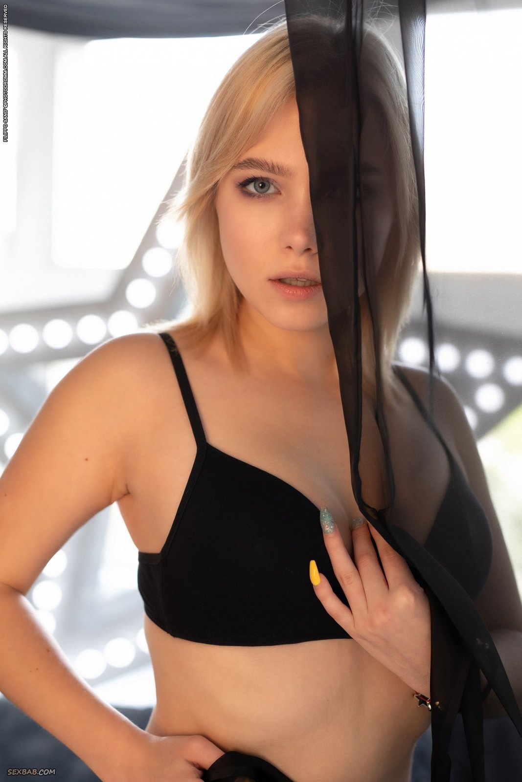 Описание: Эротично извиваясь перед камерой всем телом и постепенно сняв с себя лифчик с трусиками, сексуальная обнаженная блондинка в черных чулках возбуждающе демонстрирует нам свое нежное тело с упругими сиськами и красивой попкой и интригующе засвечивает гладкую маленькую писечку между ног.