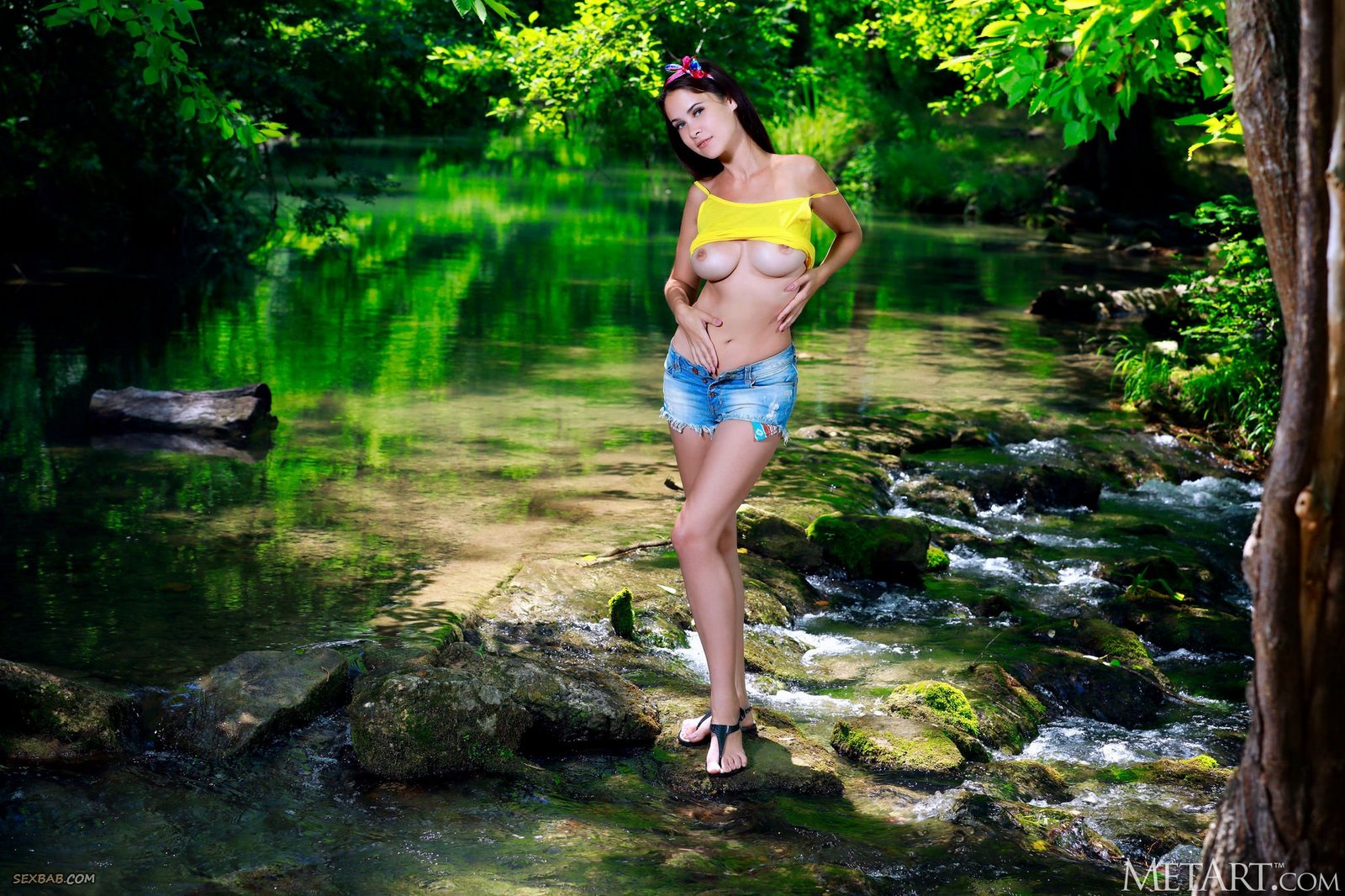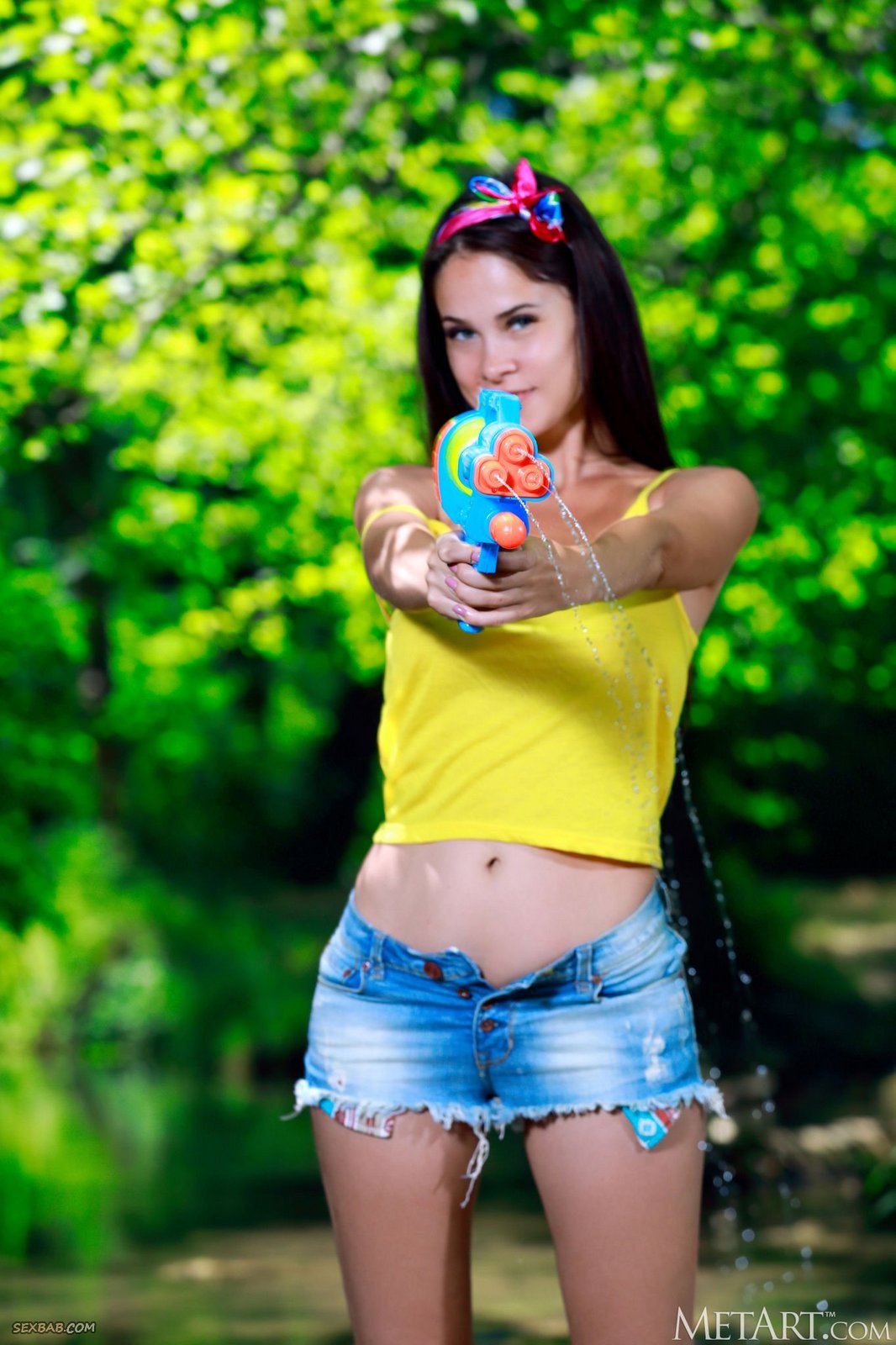 Описание: Сняв с себя яркую майку и джинсовые шортики, молодая детка с водяным пистолетом играет голой на речке, обрызгивая водой любого прохожего. Устав от активных игр, обнаженная брюнетка с большими титьками усаживается у воды на большие камни и расслабленно раздвигает ножки с голой бритой писькой.
