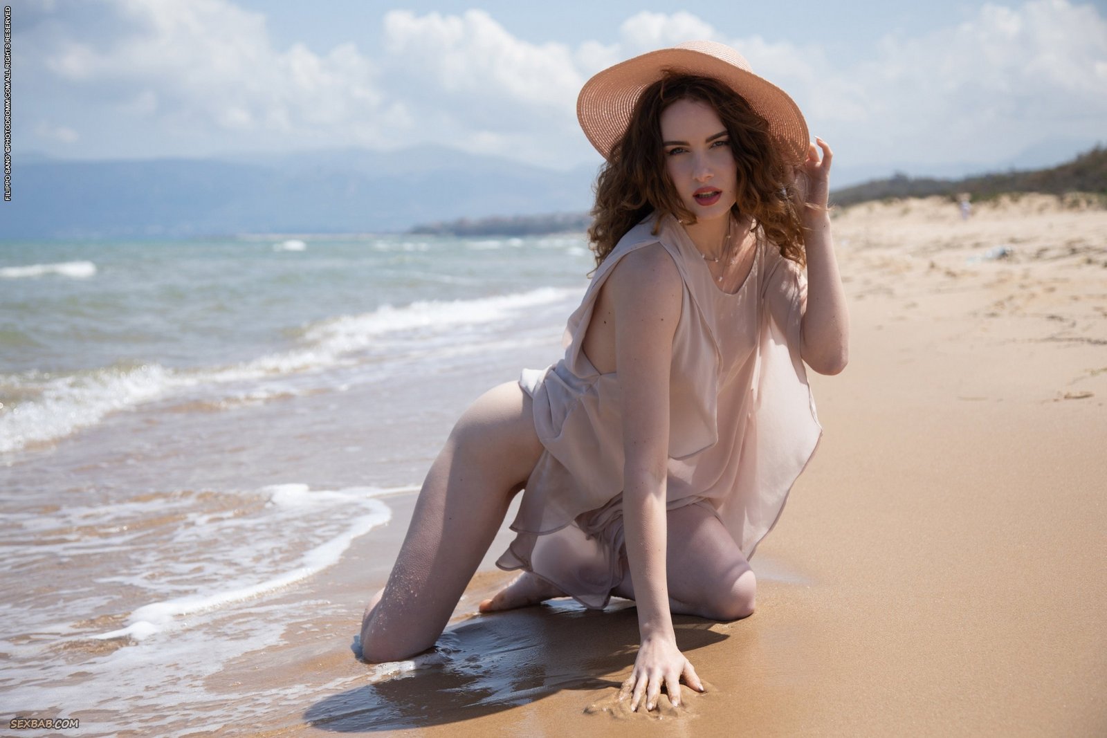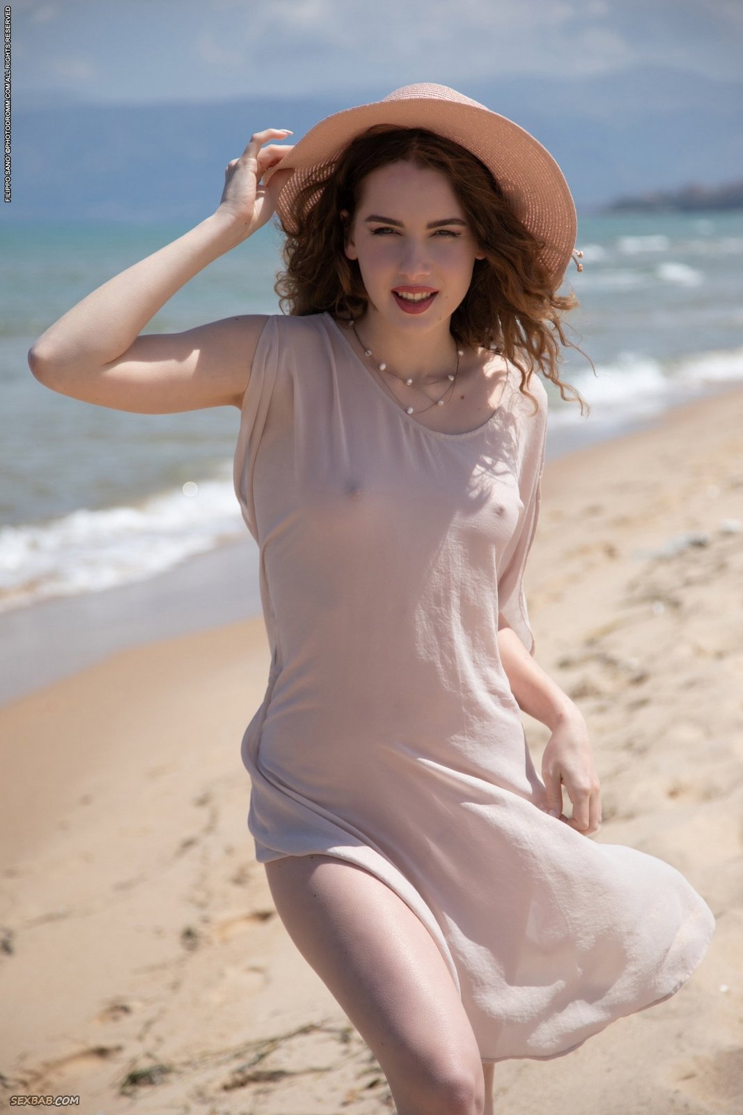 Описание: Эротично позируя перед камерой в просвечивающей одежде и кокетливой шляпке, сексуальная красотка игриво намочила свое легкое платье в море и безумно возбуждает всех отдыхающих на пляже изгибами своего тела. Постепенно раздевшись до гола, горячая штучка с натуральной упругой грудью опускается на мокрый песок и мельком засвечивает между ног свою бритую письку.