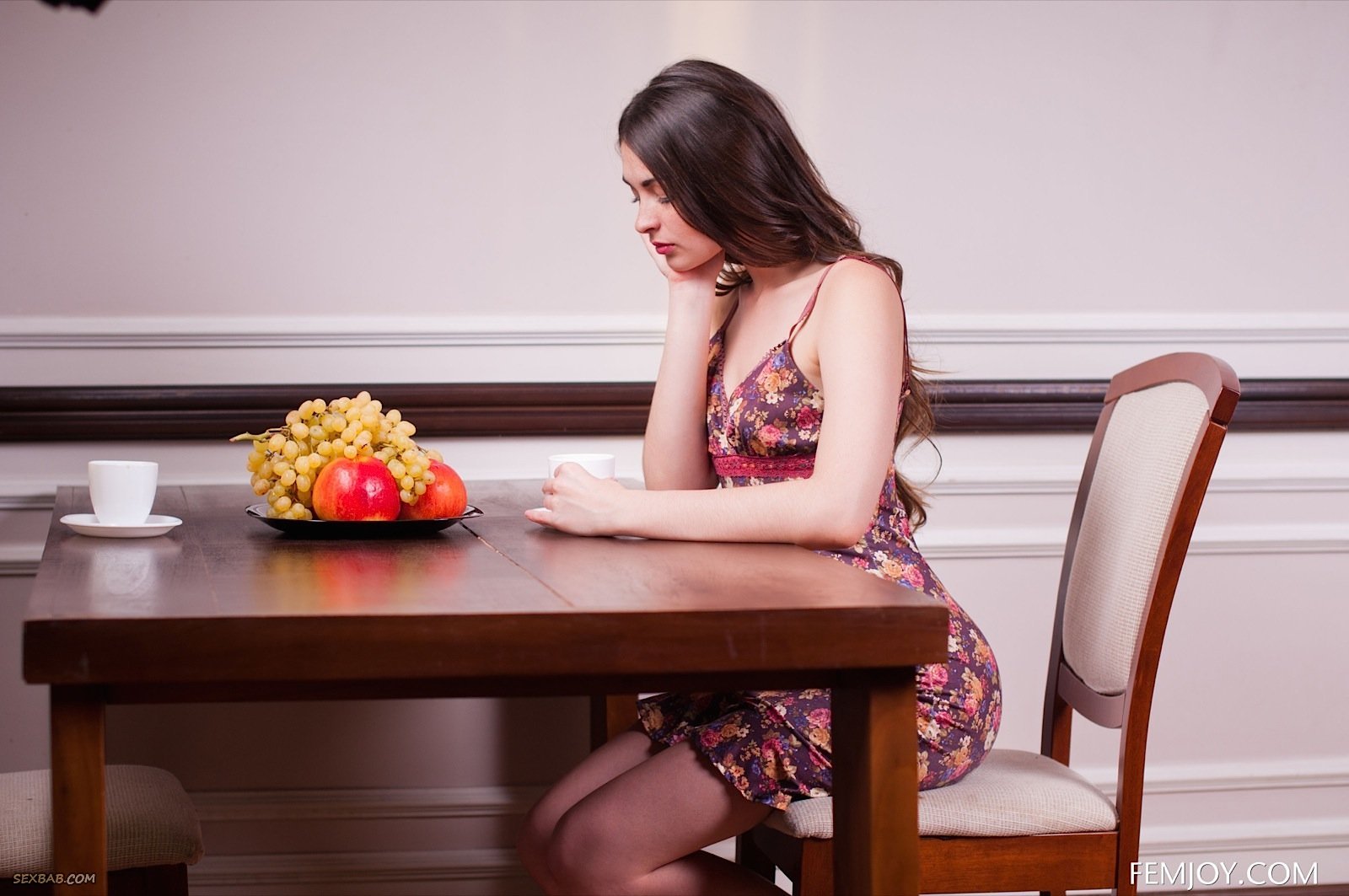 Милашка в коротком платье выгибается на стуле