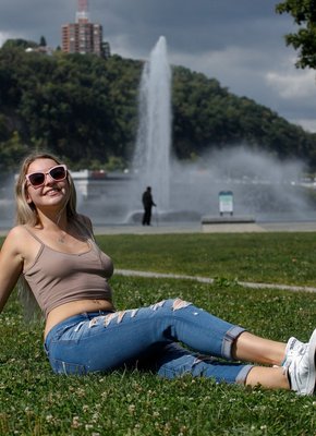 Описание: Выбравшись теплым днем на прогулку по городу, привлекательная девушка в майке, под которым не было лифчика, и джинсах ощущает от процесса желаемое наслаждение. Мило улыбаясь, в некоторые моменты сексуальная блондинка с торчащими сосочками приспускала штаны, и засвечивала трусики.