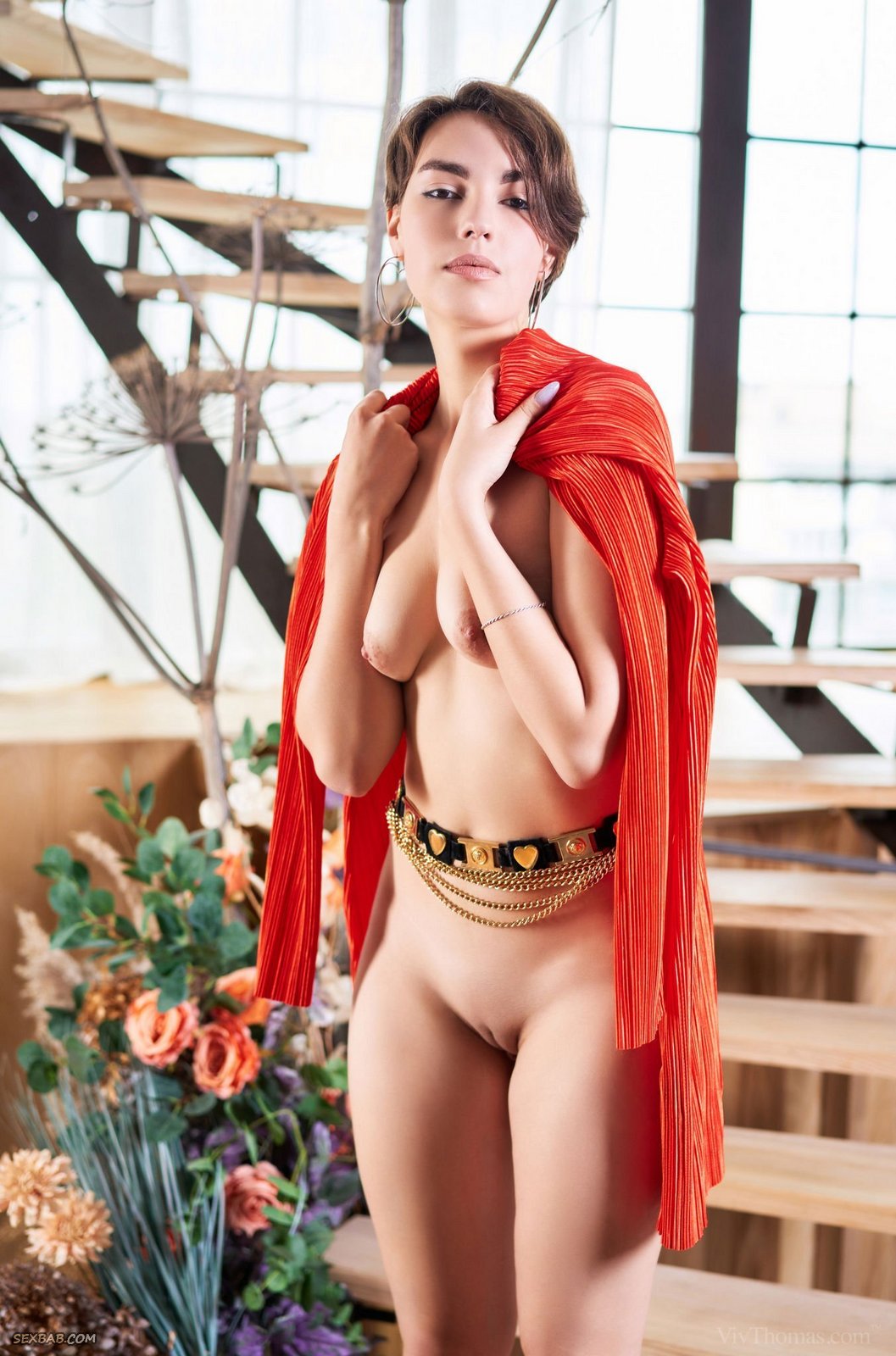 Описание: Эротично стянув со своего тела платье с трусиками, развратная тётка с миниатюрными натуральными титьками похотливо вертит перед камерой сочной голой задницей и, чувственно прогибаясь в разных возбуждающих позах, демонстрирует между ног свою гладкую нежную киску.